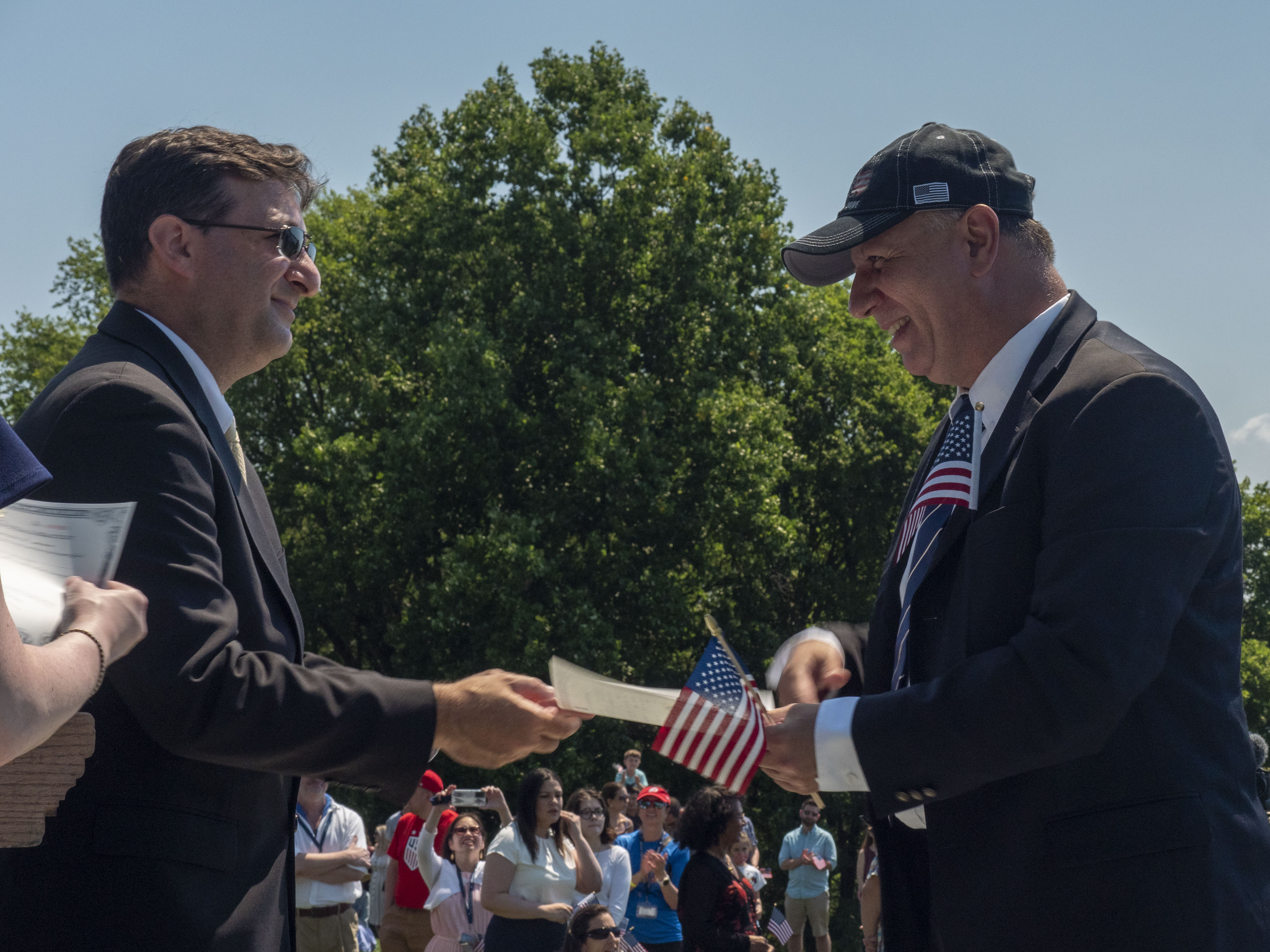 USCIS official handing Naturalization Certificate to new U.S. citizen at Mount Vernon