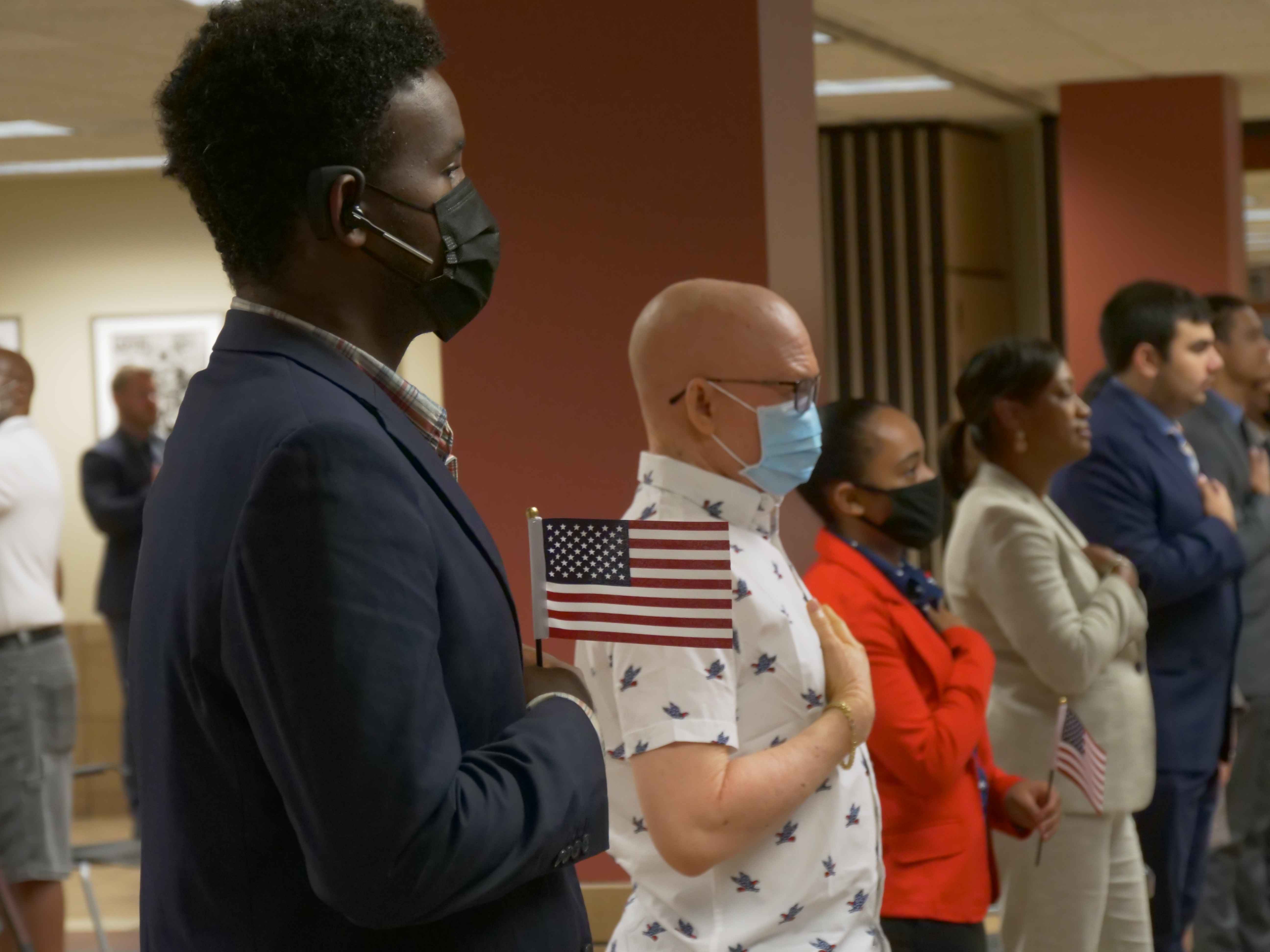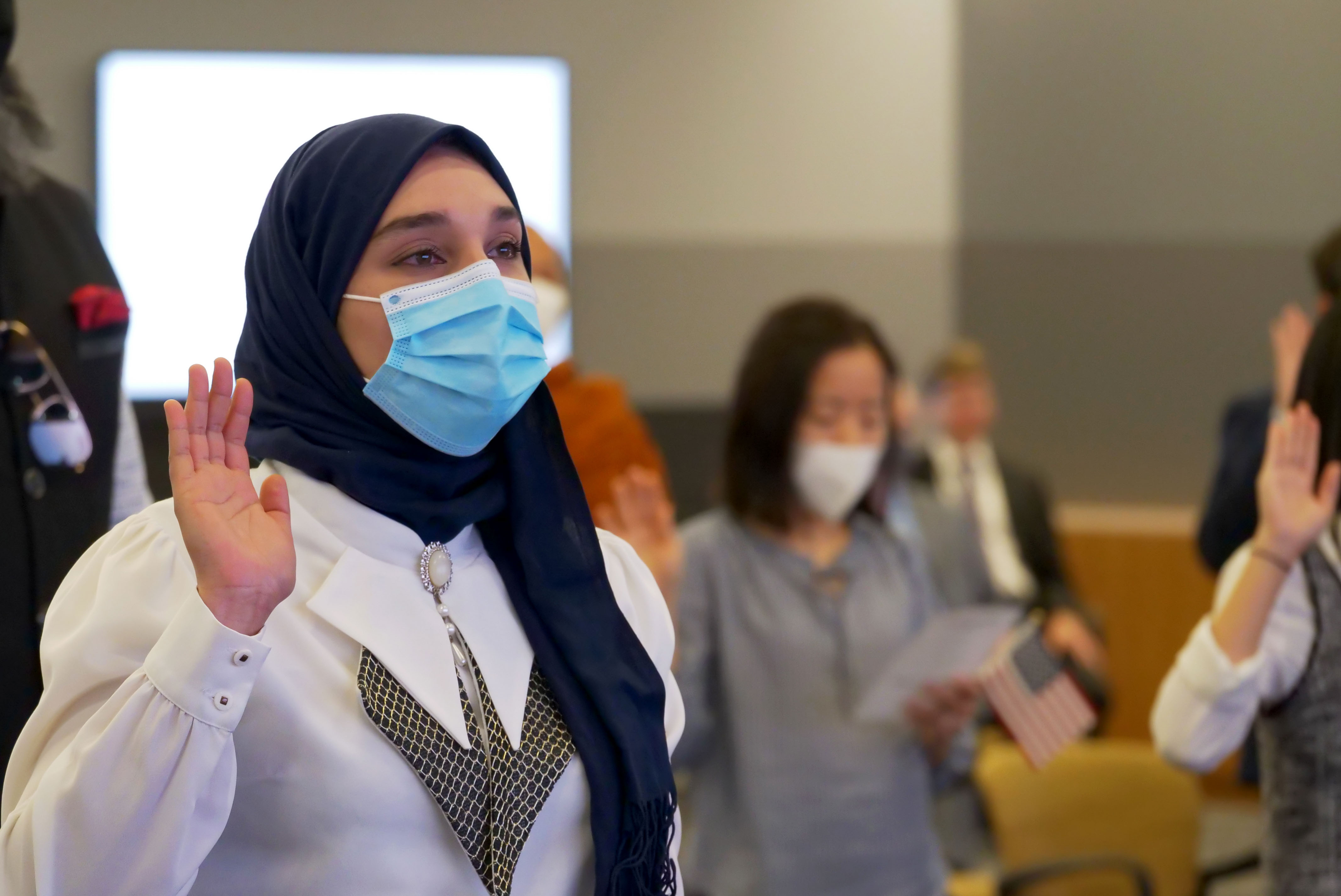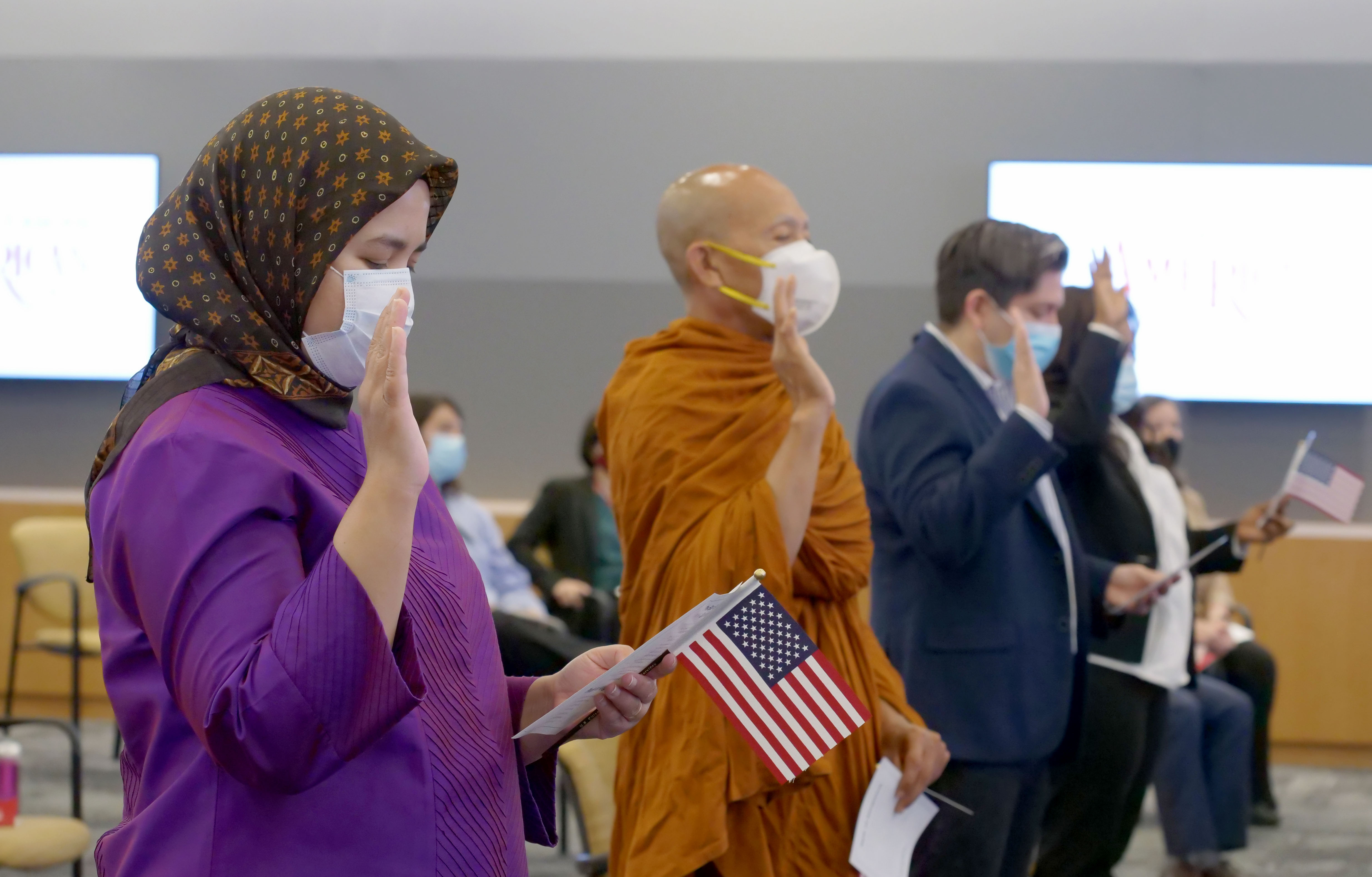 Taking the Oath of Allegiance to become citizens at USCIS headquarters