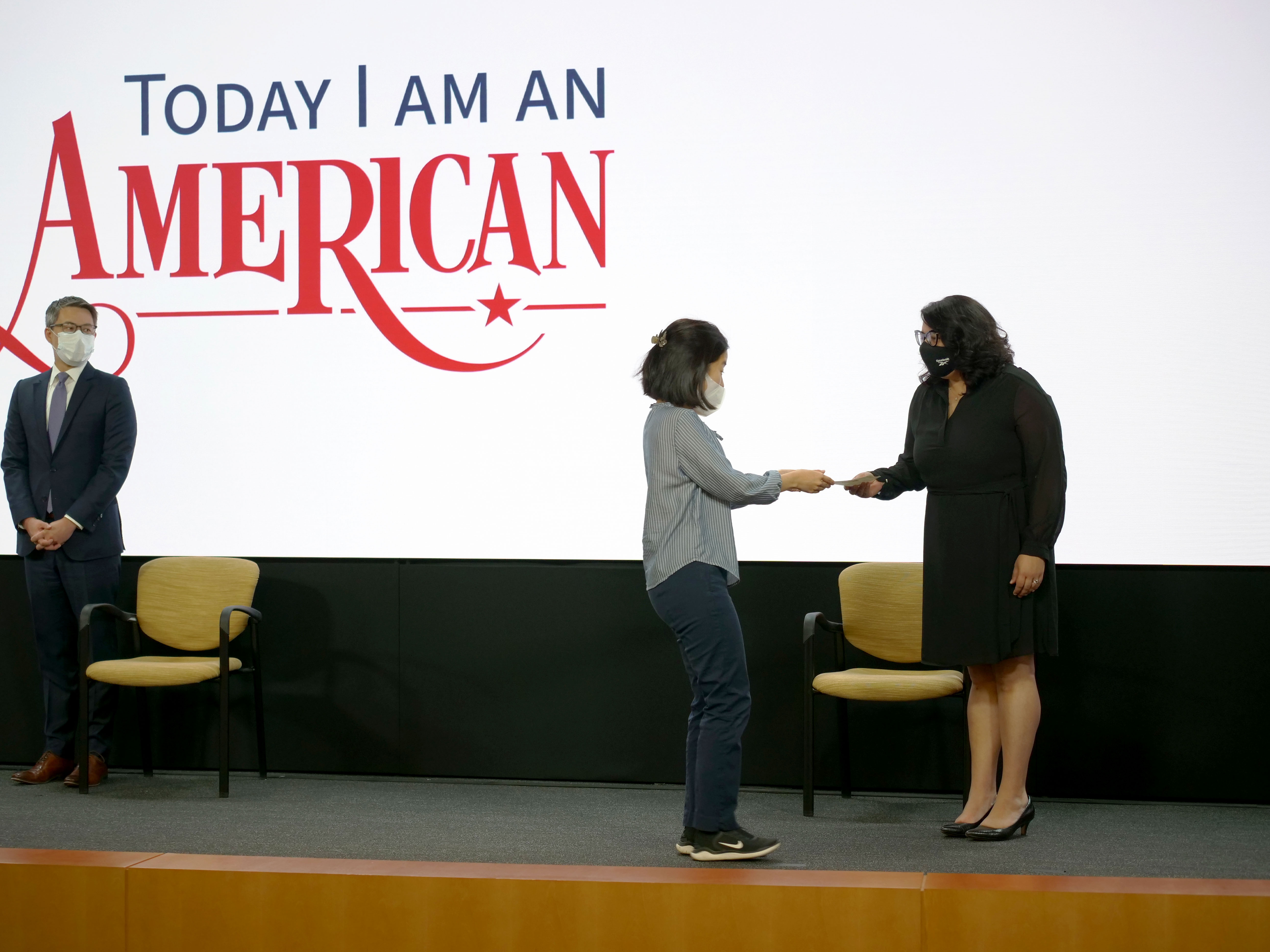 New citizen receiving her naturalization certificate at USCIS headquarters