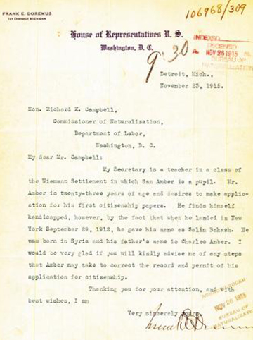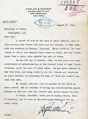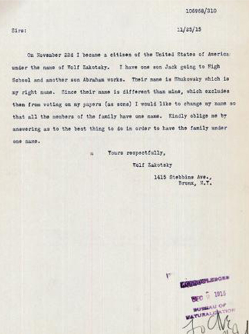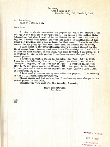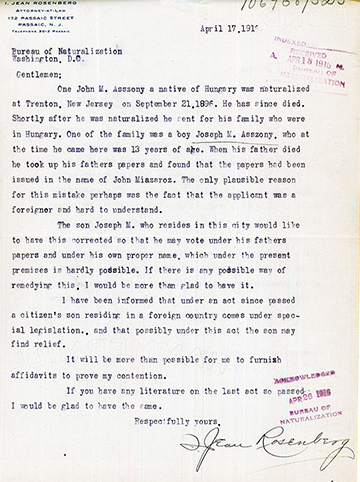 When an immigrant's new name no longer matched that shown on their official immigration record (ship passenger list), he or she might face difficulties voting, in legal proceedings, or naturalization. Below are some sample letters representing typical cases. All the examples come from official Immigration and Naturalization Service (INS) records now at the National Archives (Record Group 85) in Washington, DC, specifically Administrative Records Relating to Naturalization, 1906-1944 (Entry 26).