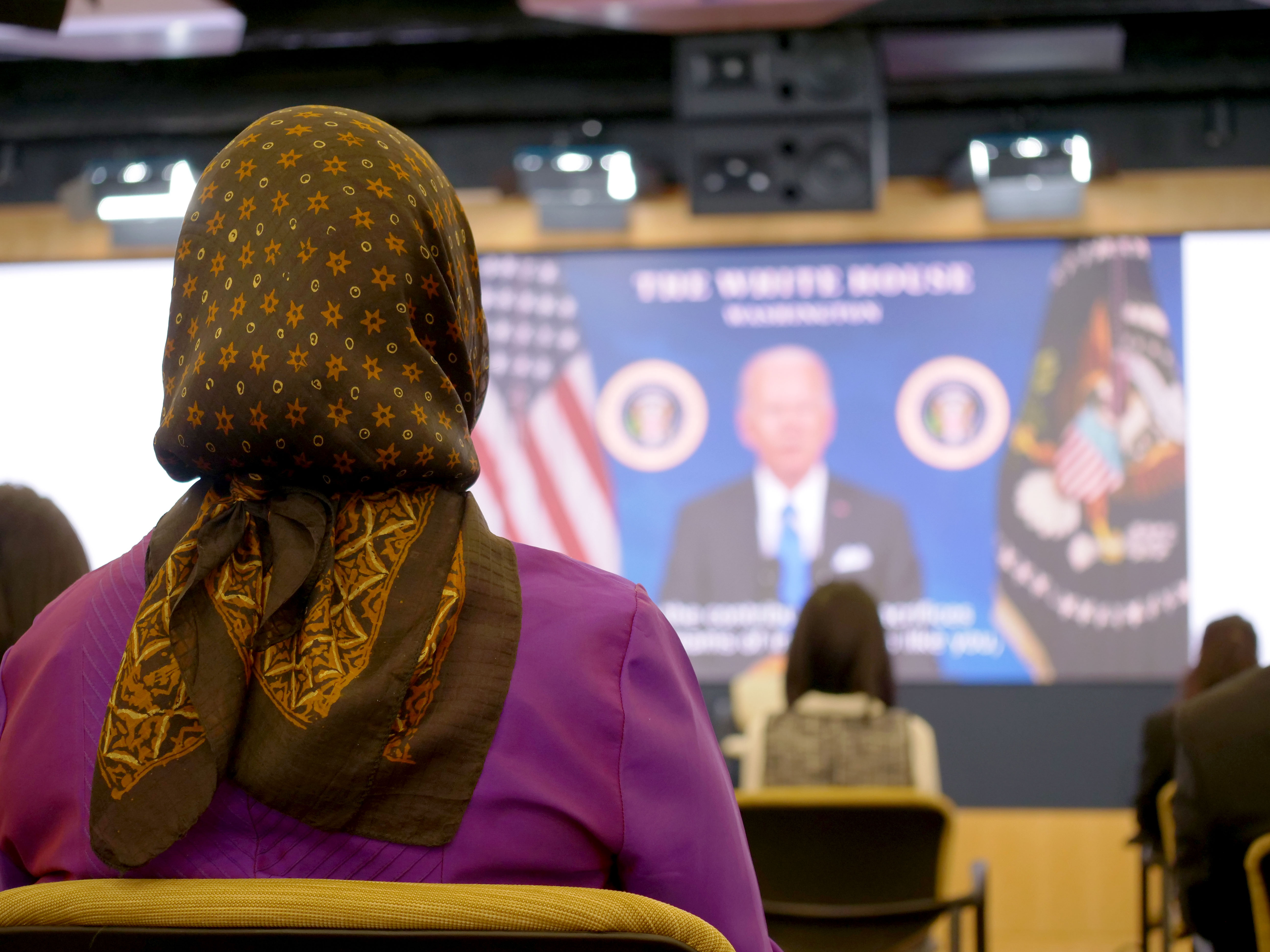 Taking the Oath of Allegiance to become citizens at USCIS headquarters